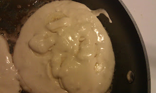Now here's my secret--I make a warm syrup and butter concoction to pour over the pancakes in my pan. I loathe cold syrup on my pancakes.